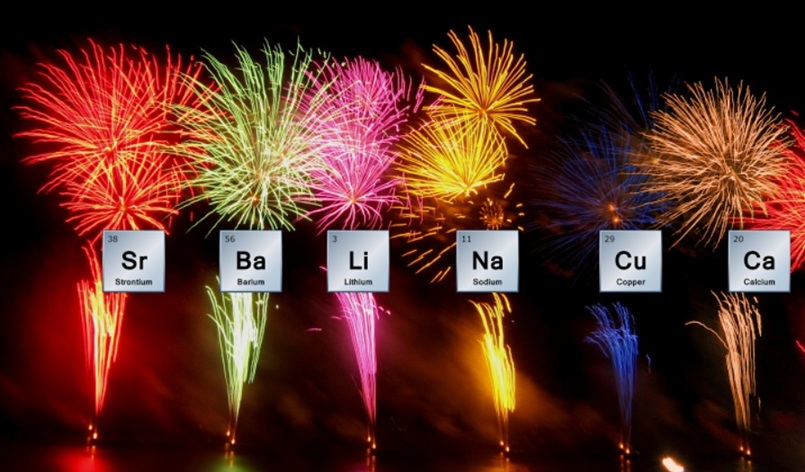Barevné ohňostroje fungují na principu excitace elektronů v kovových atomech. Různé kovy při hoření vyzařují specifické barvy světla - stroncium červenou, barium zelenou, měď modrou.