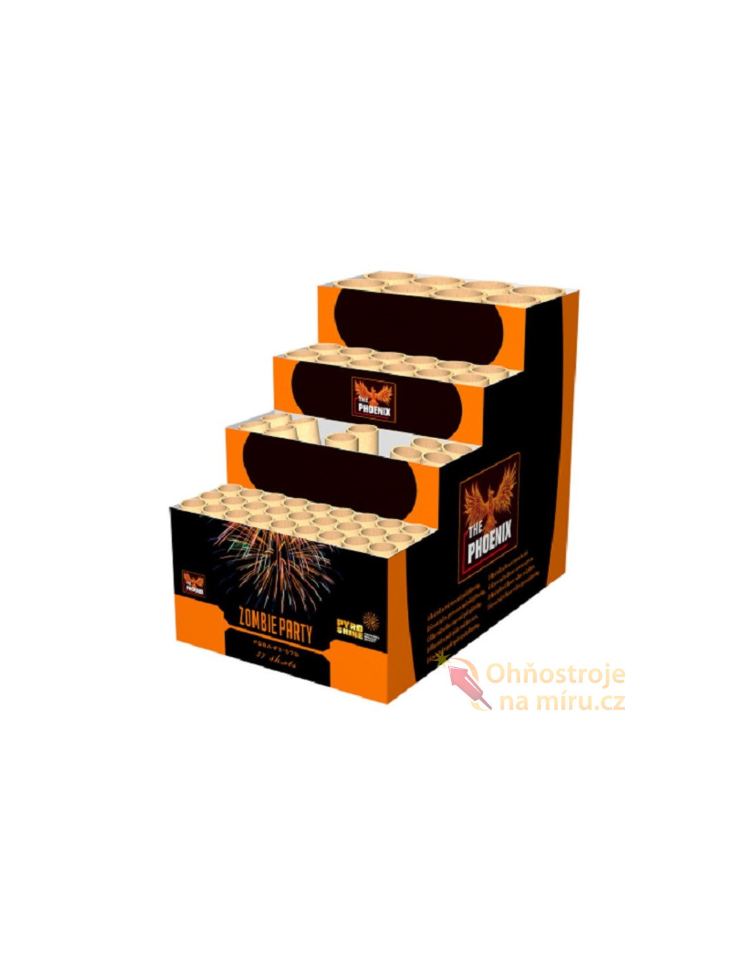 Batteriefeuerwerk Zoombie-Partyfeuerwerk enthält 57 Schüsse der Kaliber: 20 mm, 25 mm, 30 mm und 50 mm. Es schießt mehrfarbige Effekte bis zu einer Höhe von 35 – 70 m. Dank des Kalibers 50mm verfügt das Feuerwerk über ein großes, voluminöses Finale.