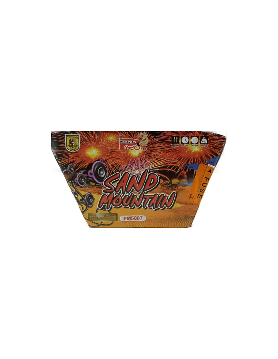 Sand Mountain Feuerwerksbatterie 36 Schuss Kaliber 20 mm mit leisen Fächereffekten, die nacheinander von links nach rechts abgefeuert werden. Ideal für Partys mit wenig Lärm ohne laute Explosionen.